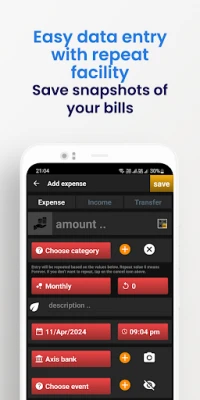 Monthly Expenses hjelper deg å enkelt få kontroll over dine utgifter og inntekter. Appen lar deg opprette budsjetter for ulike kategorier, slik at du bedre kan organisere og planlegge din økonomi på en intuitiv måte.