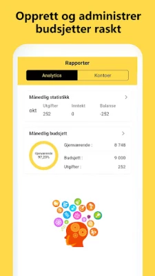 Pengeforvalter tar regnskapsføring til neste nivå med sin intelligente tilnærming. Opplev kraften i nøyaktig pengeforvaltning, der hver transaksjon registreres med presisjon, og eiendelene dine speiles nøyaktig. Ved å visualisere forbruket ditt gjennom engasjerende infografikk og stilrene diagrammer, gir Pengeforvalter deg et fugleperspektiv på hvor pengene dine går, slik at du kan ta informerte beslutninger. Sett opp smarte budsjetter for å optimalisere utgiftene dine; Pengeforvalter vil varsle deg om fremgangen din, og veilede deg mot dine sparemål og en sunnere økonomisk fremtid.