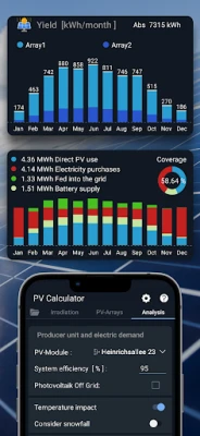 Dykk dypere inn i ditt solprosjekt med enestående detaljer og presisjon. Beregn nøyaktig hvor mye strøm du vil mate inn i nettet, og hvor mye du fortsatt trenger å kjøpe. Få klarhet i dine årlige besparelser og estimer tilbakebetalingstiden for investeringen din. Verktøyet benytter stedsspesifikk solinnstråling på timebasis og lar deg definere dine foretrukne PV-moduler og omformere. Det finner automatisk den optimale orienteringen for panelene dine, hjelper deg med å definere ditt energibehov og daglige lastprofil, og dimensjonerer ditt batterilagringssystem perfekt. Med integrerte funksjoner for takflatemåling og plassering av paneler, er du rustet til å planlegge ned til minste detalj, og best av alt – denne opplevelsen er helt reklamefri.