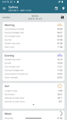 Mestre elementene og optimaliser hvert utendørsøyeblikk med Sun Position, et uunnværlig verktøy for alle som lever i takt med naturen. Enten du er en landskapsfotograf på jakt etter det perfekte lyset, en gartner som planlegger solforhold, eller en seiler som navigerer etter dagslys, gir denne appen deg nøyaktig innsikt i solens og månens bevegelser. Fra presise tider for soloppgang og solnedgang, den magiske gylne og blå timen, til detaljerte månefaser og baner for Melkeveien, presenteres all kritisk celestial data på en klar og lettfattelig måte. Sun Position er bygget for å berike dine opplevelser utendørs med pålitelig og umiddelbar informasjon.