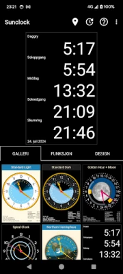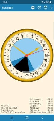 Sunclock er din personlige astronomiske klokke. Få nøyaktige tider for soloppgang, solnedgang og alle skumringens faser. Sunclock gir deg et unikt og presist bilde av dagens naturlige lysforhold, rett på skjermen din.